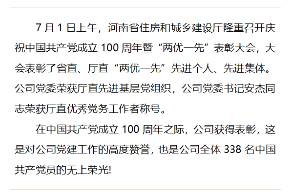 喜報(bào)! 公司黨委榮獲廳直先進(jìn)基層黨組織 安杰同志榮獲廳直優(yōu)秀黨務(wù)工作者稱號(hào)