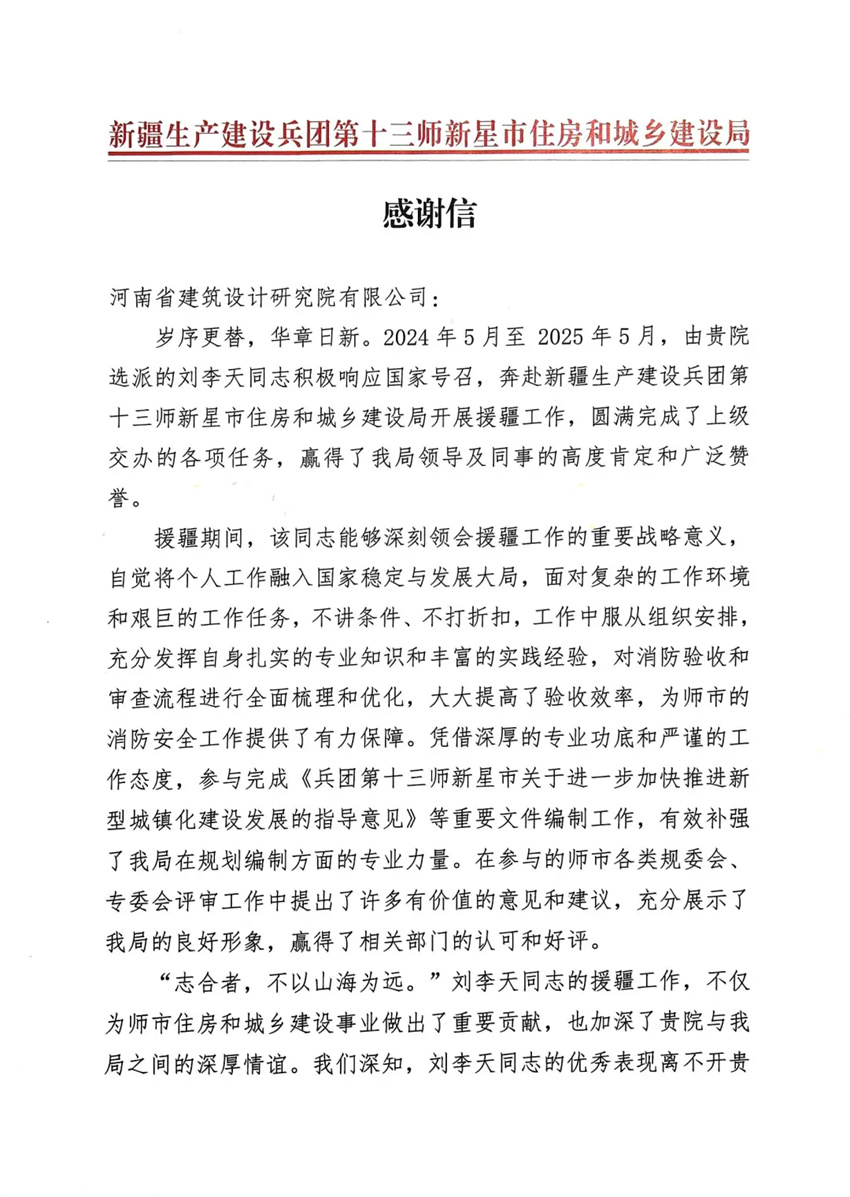 近日,從新疆生產(chǎn)建設(shè)兵團第十三師新星市住房和城鄉(xiāng)建設(shè)局傳來喜訊,我公司員工劉李天在柔性援疆工作中表現(xiàn)出色,援疆考核被評定為“優(yōu)秀”等次。