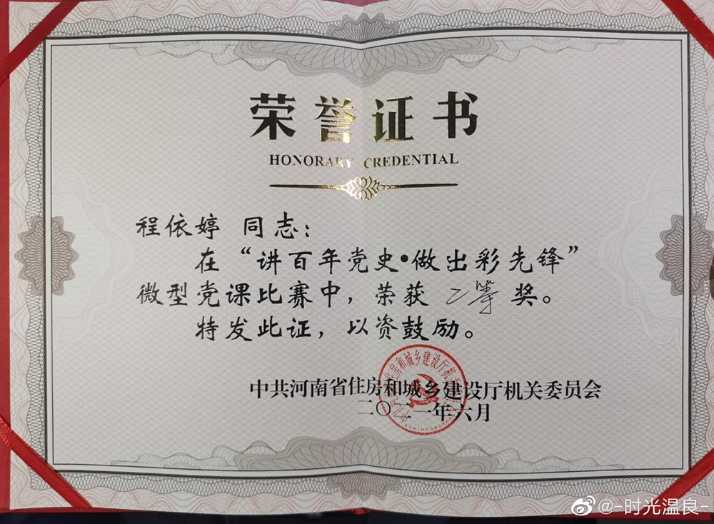 程依婷同志獲省住建廳微型黨課比賽二等獎