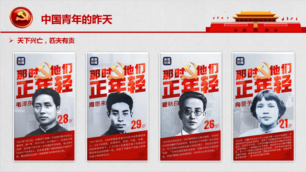 在黨的領(lǐng)導(dǎo)下,無數(shù)中國青年滿懷赤子之心,在救亡圖存、振興中華的歷史洪流中譜寫了一首首蕩氣回腸的青春之歌。先輩創(chuàng)業(yè)之艱辛,我們今人可能難以體會?!疤煜屡d亡,匹夫有責”,是先輩們?nèi)谌牍茄男拍?。那時他們正年輕,恰同學少年,卻干出了驚天動地的大事。