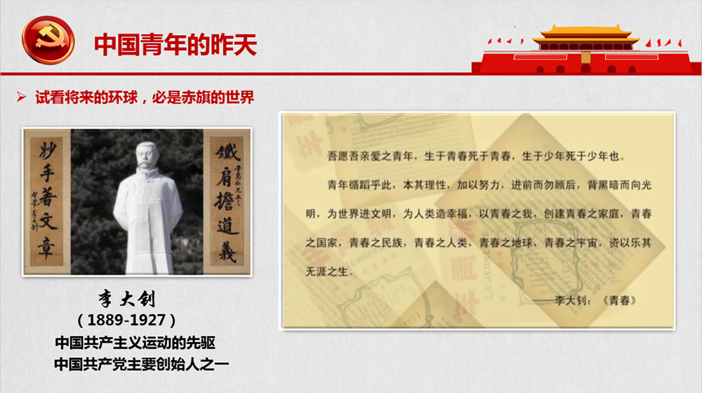 27歲的李大釗向青年發(fā)出“青春中華”理想的召喚?!耙郧啻褐?,創(chuàng)建青春之國家,青春之民族”。宣誓著年輕生命的綻放,宣誓著青年一代的責任,更宣誓著再創(chuàng)青春中華的偉大夢想。在軍閥大肆鎮(zhèn)壓國共兩黨革命人士的白色恐怖中,在極端危險和困難的情況下,他繼續(xù)領(lǐng)導(dǎo)黨的北方組織堅持革命斗爭近一年之久。被捕后,即使備受酷刑,李大釗同志始終嚴守黨的秘密,堅貞不屈。在生命的最后,他高呼著“共產(chǎn)黨萬歲”,犧牲在絞刑架上,英勇就義,年僅38歲。