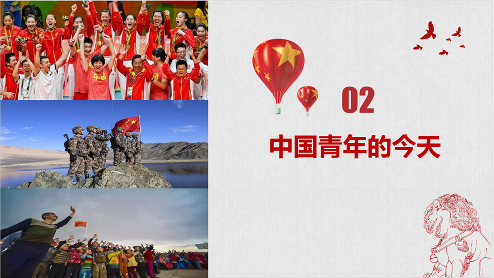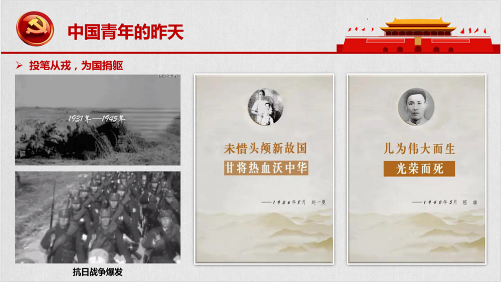 抗日戰(zhàn)爭爆發(fā)后,無數(shù)青年投筆從戎,為國捐軀,哪里有斗爭哪里就有他們的身影;哪里有侵略者,哪里就有他們的犧牲。31歲犧牲的趙一曼說:“未惜頭顱興故國,甘將熱血沃中華?!?4歲犧牲的程雄說:“為偉大而生,為光榮而死。”這些就是百年前用生命改變中國的青春宣言!還有許許多多在國家和民族危難之際挺身而出的中國青年,以生命之鐘撞響舊中國的黎明。革命先驅(qū)用鮮血和生命換來的偉大事業(yè),一定會千秋萬代××變色