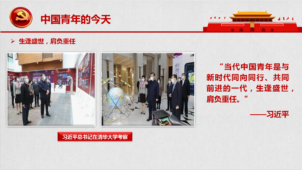 今年4月份,習近平總書記在清華大學考察時強調(diào),“當代中國青年是與新時代同向同行、共同前進的一代,生逢盛世,肩負重任?!?