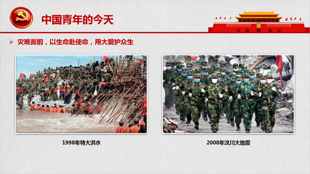 我們在生活的每一處,詮釋著時代的青春與希望。在長江流域特大洪水泛濫、家園被毀時,70后用身體擋住江河,筑起鋼鐵城墻;汶川大地震,80后用肩膀扛起殘垣,撐起生的希望;