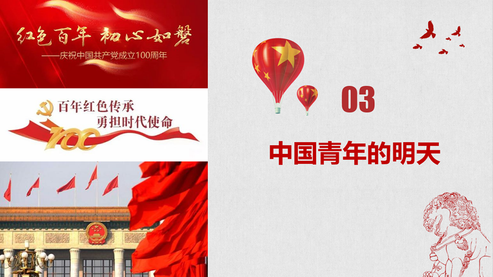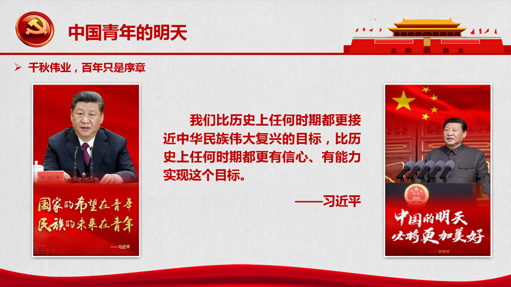 青年力量是整個社會力量中最積極、最有生氣的力量,國家的希望在青年,民族的未來在青年。我們比歷史上任何時期都更接近中華民族偉大復(fù)興的目標,比歷史上任何時期都更有信心、有能力實現(xiàn)這個目標。乘風破浪會有時,直掛云帆濟滄海!走下去,新一代青年!懷揣著從星星之火時就燃起的信念;懷揣著在槍林彈雨中未曾放棄的信念;懷揣著在改革開放中越發(fā)堅定的信念;懷揣著在新時代奔向偉大復(fù)興的信念。走下去,向著下一個百年!