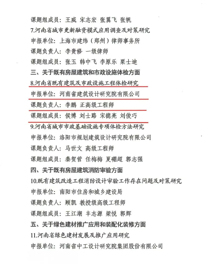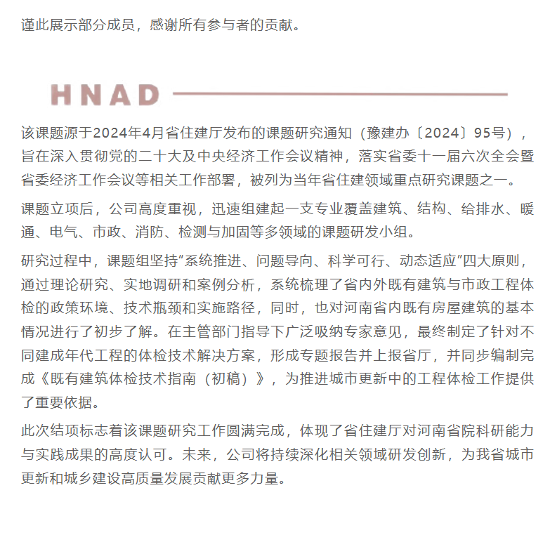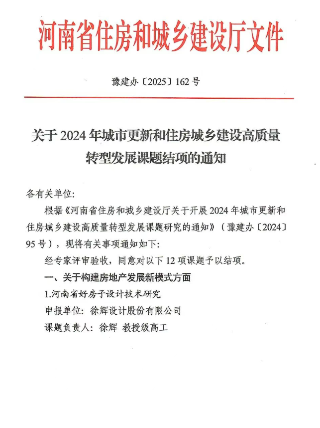 2025年8月,河南省住房和城鄉(xiāng)建設(shè)廳印發(fā)《關(guān)于2024年城市更新和住房城鄉(xiāng)建設(shè)高質(zhì)量轉(zhuǎn)型發(fā)展課題結(jié)項(xiàng)的通知》(豫建辦〔2025〕162號(hào)),正式公布課題評(píng)審結(jié)果。河南省院申報(bào)的《河南省既有建筑及市政工程體檢研究》課題經(jīng)專家嚴(yán)格評(píng)審,順利通過驗(yàn)收,成功結(jié)項(xiàng)。