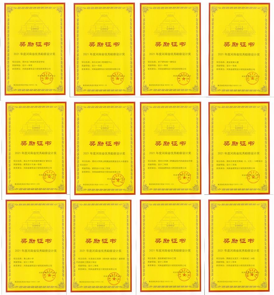 建業(yè)智慧大廈榮獲建筑設計一等獎;老子研究院一期項目榮獲建筑設計一等獎;南水北調工程調度中心榮獲建筑設計一等獎;鄭州名門楓楊外國語學校榮獲建筑設計一等獎;商丘市中醫(yī)院整體搬遷擴建項目榮獲建筑設計方案一等獎;青山路小學榮獲建筑設計二等獎;鄭州百榮世貿商城(2、3區(qū))-1#樓項目榮獲建筑設計二等獎;鄭州大學第二附屬醫(yī)院內科病房綜合樓榮獲建筑設計二等獎;鄭州大學第五附屬醫(yī)院康復綜合大樓建設項目設計榮獲建筑設計方案二等獎;周新莊安置區(qū)(中晟瑞城) 5 #樓等3項榮獲建筑設計三等獎;溫縣新城區(qū)供水工程榮獲設計三等獎;社旗縣紅旗路(鄭州路-榆園街)道路提升改造施工圖設計項目榮獲設計三等獎;