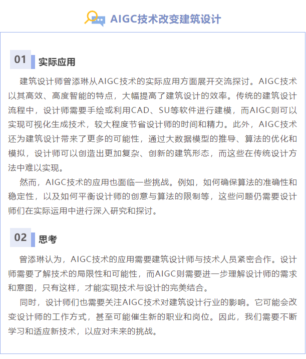 本次分享會(huì)從不同維度詳細(xì)地介紹了AIGC技術(shù)在建筑設(shè)計(jì)工作中的運(yùn)用,為設(shè)計(jì)工作提供了可探討學(xué)習(xí)的方向。在未來(lái)的工作中,河南省院將繼續(xù)深入研究和應(yīng)用AIGC技術(shù),努力探索技術(shù)與設(shè)計(jì)的最佳結(jié)合點(diǎn)。同時(shí)我們也將與更多的同行交流和合作,共同推動(dòng)建筑設(shè)計(jì)行業(yè)的發(fā)展和創(chuàng)新。