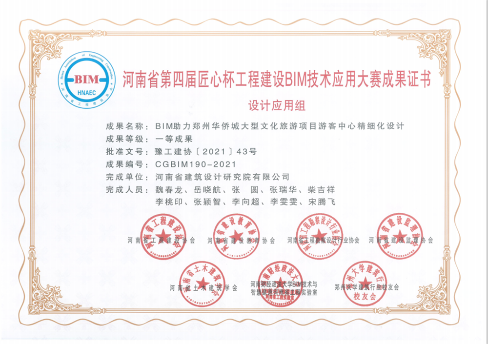 公司 三分院 BIM技術(shù)應(yīng)用中心 榮獲河南省第四屆匠心杯競賽設(shè)計(jì)組一等成果,獲獎(jiǎng)項(xiàng)目為“BIM技術(shù)助力鄭州中原華僑城大型文化旅游項(xiàng)目游客中心精細(xì)化設(shè)計(jì)”。