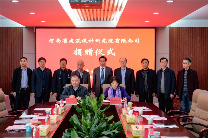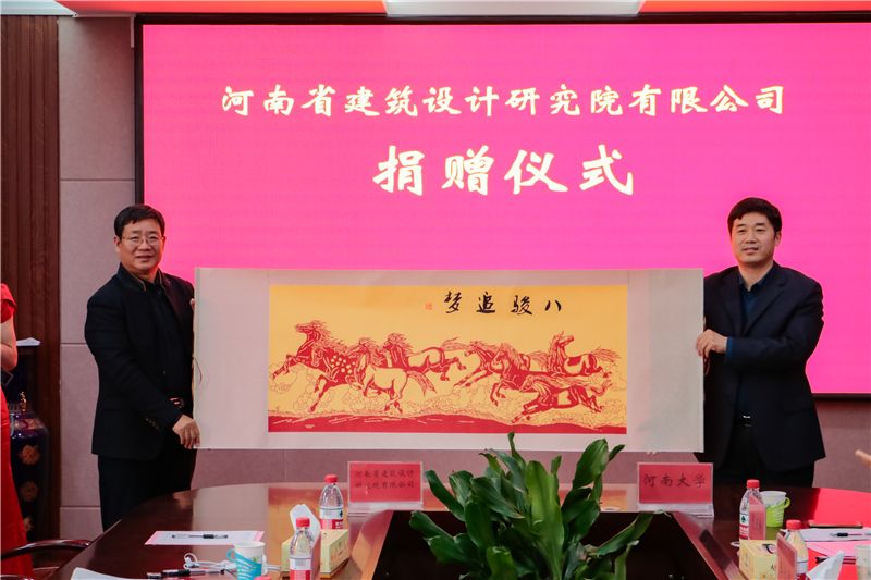 儀式上,河南省建筑設(shè)計(jì)研究院有限公司總工程師蔡黎明代表公司簽訂了捐贈(zèng)協(xié)議,并接受了捐贈(zèng)證書(shū)和紀(jì)念杯;河南大學(xué)土木建筑學(xué)院黨委書(shū)記李社教接受捐贈(zèng)。公司財(cái)務(wù)總監(jiān)韓兆海接受了河南大學(xué)土木土木建筑學(xué)院院長(zhǎng)岳建偉代表學(xué)?;刭?zèng)的“八駿追夢(mèng)”圖。
