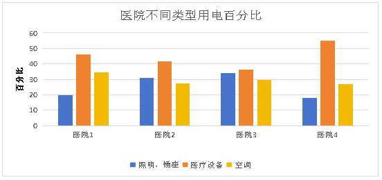 從以上數(shù)據(jù)可以看出,醫(yī)療建筑中照明用電量約占30-35%左右,動力用電占35-45%左右,空調(diào)用電占30-40%左右。