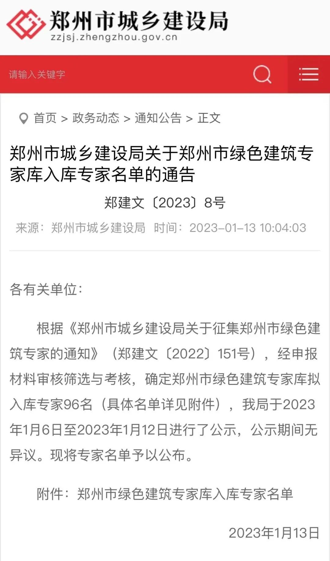 《鄭州市城鄉(xiāng)建設(shè)局關(guān)于鄭州市綠色建筑專家?guī)烊霂鞂<颐麊蔚耐ǜ妗罚ㄠ嵔ㄎ摹?023〕8號)現(xiàn)已發(fā)布,河南省建筑設(shè)計研究院有限公司徐公印、侯博、趙喆、張俊杰、牛沁勇、黃建設(shè)、曹沛源、萬寧入選鄭州市綠色建筑專家。