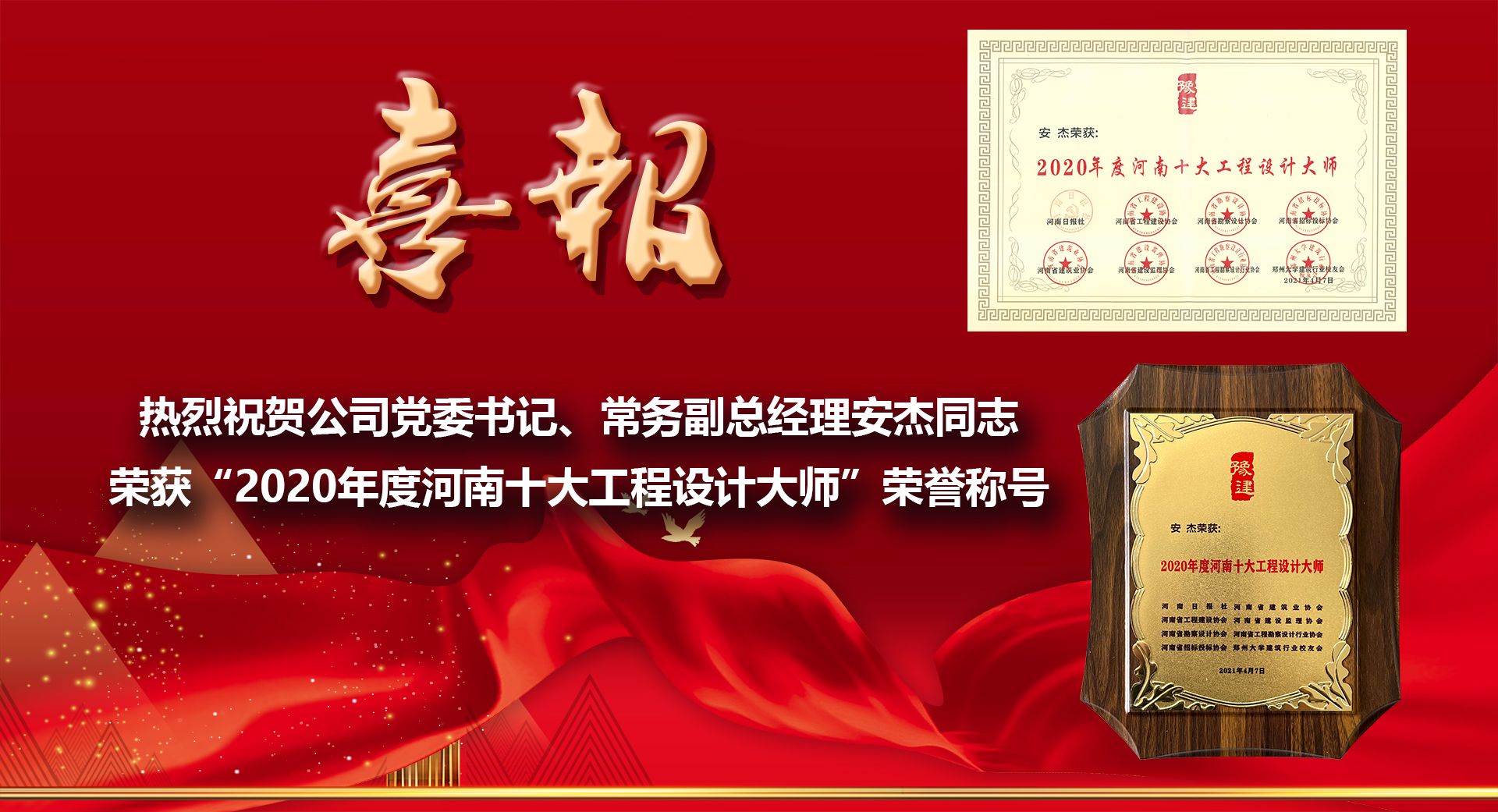 公司黨委書記、常務(wù)副總經(jīng)理安杰同志榮獲“2020年度河南十大工程設(shè)計大師”榮譽稱號